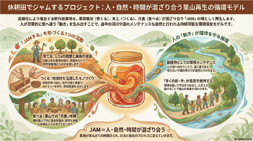 人が関わることで環境が育ち、 環境があることで人がまた関われる。 私たちは、この循環を『JAMする』と呼んでいます。 整備したり囲ったりするのではなく、 使い続けることで守っていく。 育てる、つくる、食べる。 そんな日常の延長の中でこそ、風景が続いていきます。植えた果樹でジャムをつくるように、 時間をかけて、恵みを分かち合う。そうなったら素敵だなと思っています。